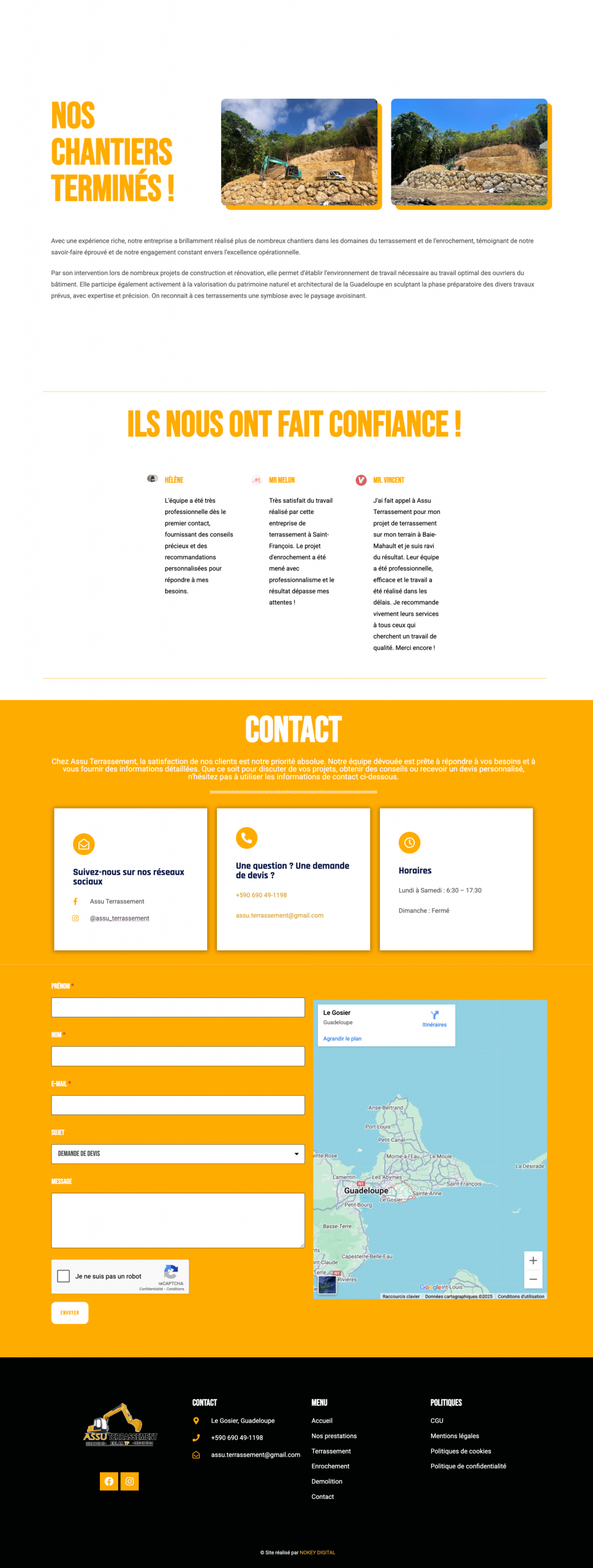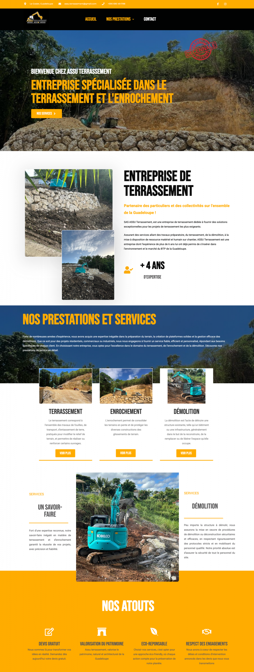 Assu Terrassement est une entreprise spécialisée dans les travaux de terrassement, d’assainissement et d’aménagement extérieur, basée en Guadeloupe. Elle intervient auprès des particuliers et professionnels pour des projets de construction, de rénovation ou de mise en conformité des réseaux. Pour ce projet, Nous avons conçu et développé l’ensemble du site internet, de la structure à la mise en ligne, en mettant en avant : Les prestations clés de l’entreprise, une navigation fluide et responsive, un design professionnel aligné à leur image de marque.